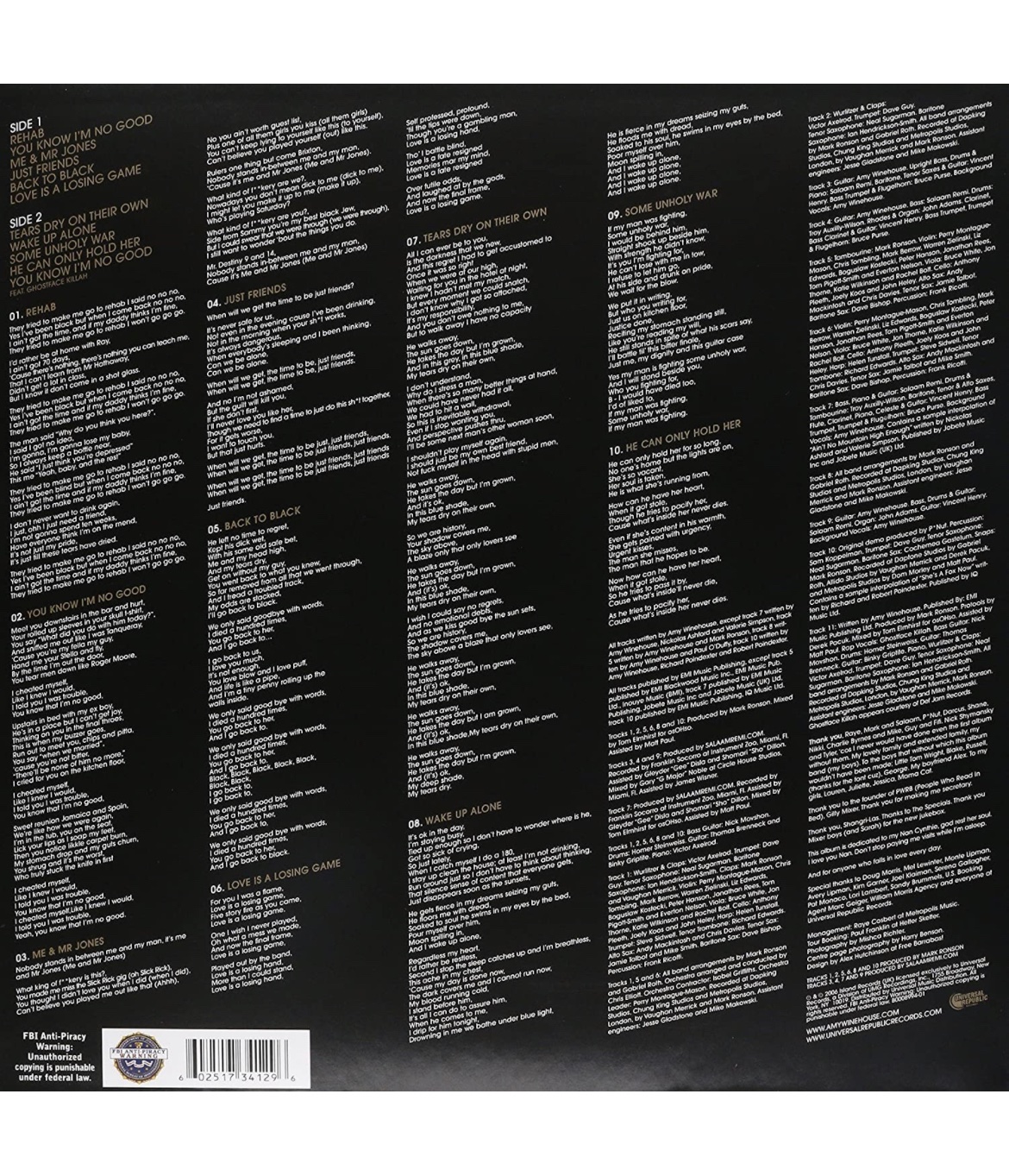 Back to Black es el segundo y último álbum de estudio de la cantante y compositora inglesa Amy Winehouse, lanzado el 27 de octubre de 2006 por Island Records. Winehouse basó predominantemente el álbum en su tumultuosa relación con Blake Fielder-Civil, quien la dejó temporalmente para perseguir a una exnovia. Su breve separación impulsó a Winehouse a crear un álbum que explora temas de culpa, dolor, infidelidad, desamor y trauma en una relación.