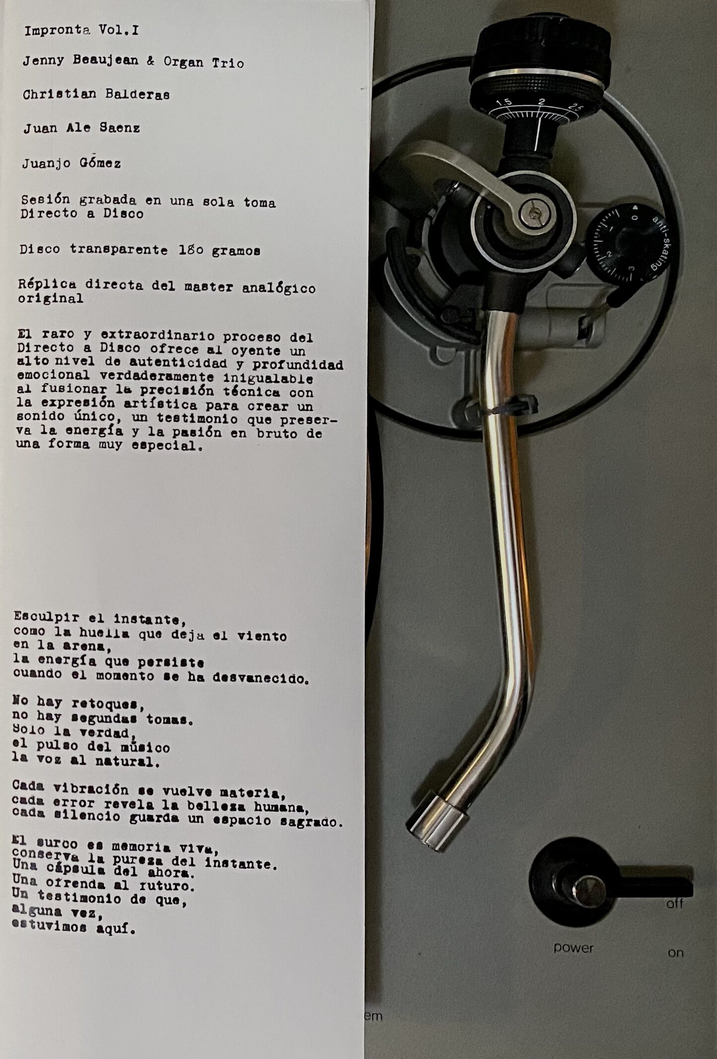 Una joya sonora: Impronta Vol. 1 de Jenny Beaujean & Organ Trio, grabado en vivo directamente en laca con la exclusiva Neumann VMS-80. Sin ediciones, sin artificios, solo la esencia pura del concierto